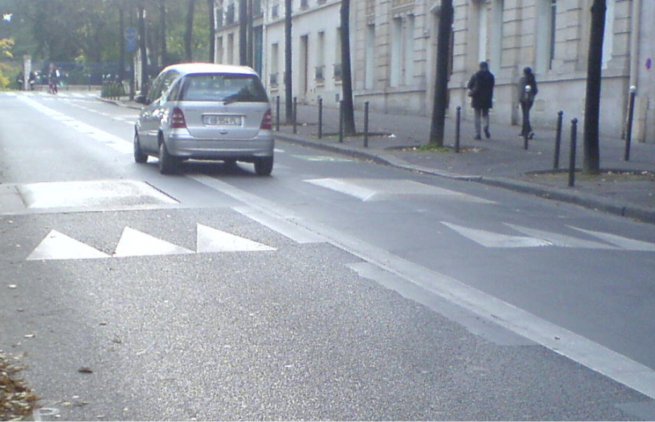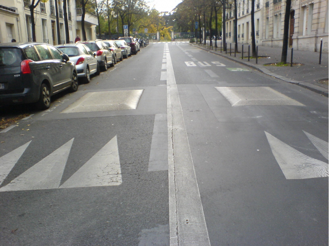 Speed bumps are quite effective in slowing down traffic. Provided they are clearly visible and wear their heart on their sleeve. France uses at least two types of speed bumps (they were cozily called “sleeping policemen”, “gendarmes couchés”): prism-like center bumps, and hilly, rounded bumps that go from sidewalk to sidewalk. On top of that, there are other methods that basically shrink the lane so that only one car at a time can drive in either direction; more about this in another post.