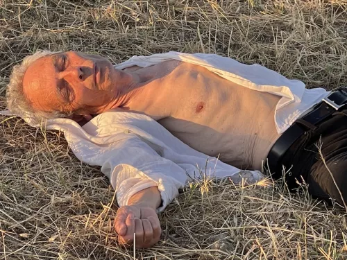 Una scarpa è poco distante, un calzino è sfilato a metà. In un cespuglio troviamo una ragazza ‘morta’ tenendo un paio di occhiali da sole nelle mani e un uomo appeso per i piedi ai rami. Un altro uomo è sul ciglio del burrone verso la vallata, con i pantaloni un po’ abbassati e le mutande quasi sfilate. Un’altra salma, di donna, vestita in modo compito, avvolta in una coperta, è più avanti. E un’altra figura ancora la troviamo con i lunghi capelli distesi tra l’erba secca e il grano tagliato.
