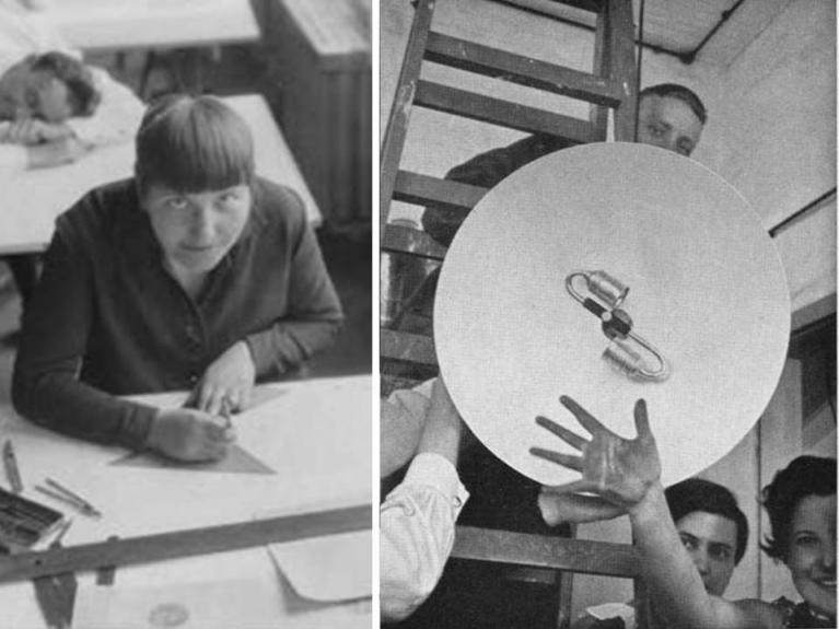 Lotte Beese e Helmut Schulze al tavolo da disegno, 1928; Marianne Brandt scherza nell'Officina dei Metalli, 1928.