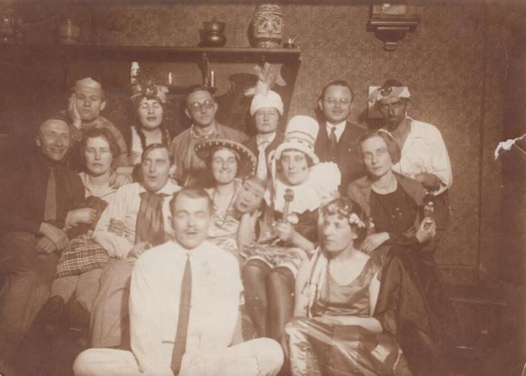 Festa in maschera al Bauhaus di Weimar 1919, circa. Dora Wibiral è al centro con un cappello e la gorgiera, alla sua destra Dorothea Seeligmüller.