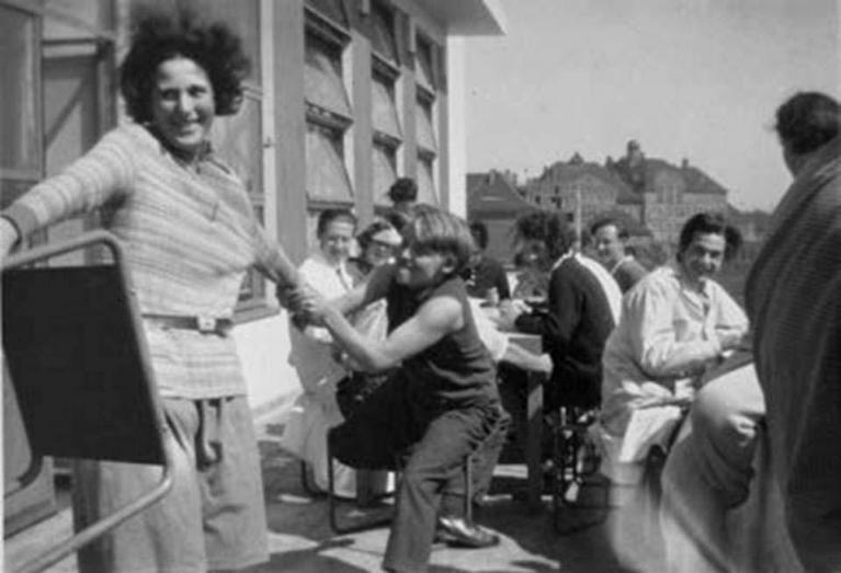 Sulla terrazza del nuovo edificio del Bauhaus di Dessau, davanti alla mensa, con gli sgabelli di Marcel Breuer. Da sinistra: Lotte Gerson-Collein, dietro Erich Holthoff e uno sconosciuto; Karla Grosch, al centro,“in azione”. 1929, circa.