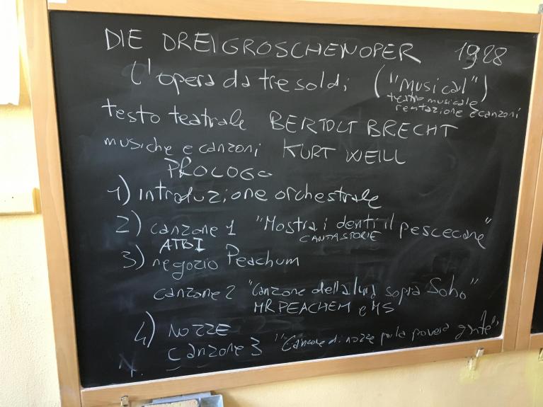 Poi siamo venuti al dopoguerra, al capitalismo di massa, al comunismo di Lenin, parlando di come ancora oggi il capitalismo consumistico con le sue leggi e il suo sistema repressivo ci manipolano per renderci infelici e instradarci a spendere tutti i soldi che abbiamo per comprare oggetti con obsolescenza programmata, per “regalarci” qualche istante di “felicità”. Mi è tornato in mente Brecht, il suo teatro senza quarta parete, ancora perfetto come educazione allo smascheramento. Nelle antologie che i colleghi hanno fatto adottare non c’è una riga su Brecht. Ho messo tutti i materiali sulla classroom digitale, e ho fatto BYOD (Bring You Own Device). Invece di demonizzare gli smartphone e tentare pateticamente di tenerli fuori dalla scuola, ho messo contenuti sui loro smartphone. Belli risvegliati si sono scaricati l'app della piattaforma educational. Lettura a tavolino dell’Opera da tre soldi. Azhar aveva detto che vuole imparare il tedesco e andare al liceo, per poi raggiungere ad Hannover i suoi cugini e vivere in Germania, perché là è tutto pulito e la gente si comporta bene. Ascolta le canzoni di Weill in tedesco. Che personaggio fa? Peachum, ovvio! Il ruffiano, l’impostore ipocrita che nella sua bottega di ONG buonista organizza capillarmente sulla mappa di Soho la sua compagnia di falsi accattoni.