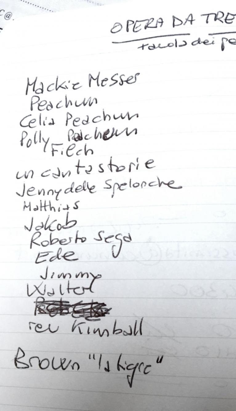 Floro, l’inca che fa il clown ogni mattina e che alle 15 crolla addormentato nelle stanze dell’associazione di quartiere dove dovrebbe fare i compiti, farà il cantastorie: il buffone che sa tutto e svela l’ipocrisia; nelle prove a tavolino non voleva leggere, diceva «tanto non so leggere, non faccio niente, tanto non riesco a capire niente», ma tutti, compagni e prof, aspettavamo che ad ogni battuta lui schernendosi riprendesse a interpretare. Canteranno in coro la triste cinica beffarda “Canzone di nozze per povera gente”, una lagna musicalmente lugubre e letteralmente cinica: