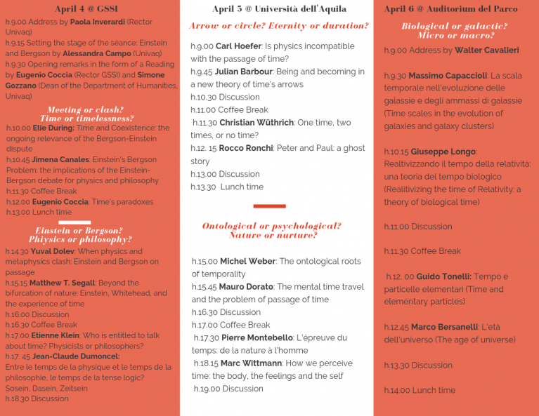 Come scienziati e filosofi impegnati nelle strutture universitarie e nei laboratori di ricerca presenti sul territorio aquilano, ci siamo chiesti come commemorare in modo positivo e fiducioso il decennale del terremoto che ha colpito L’Aquila il 6 aprile 2009 e una fortunata coincidenza di date, ma anche di eventi, ci è venuta in soccorso. Il 6 aprile 1922, alla Sociéte française de Philosophie di Parigi, Albert Einstein incontra per la prima volta Henri Bergson per discutere della natura del tempo alla luce della teoria della relatività. Il tempo di cui si occupa il fisico – chiedeva Einstein – è lo stesso su cui riflette il filosofo?