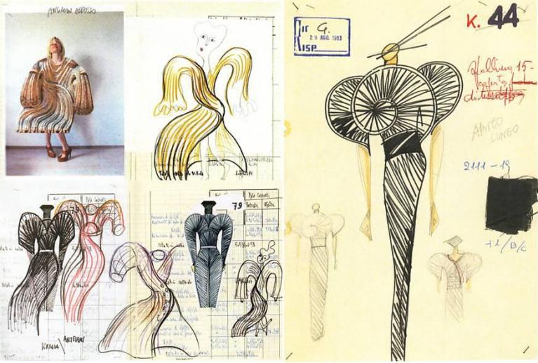 A sinistra: Sissi, studi per l'Abito Antelamato, dettagli dal diario Storie di fili, 2019-2020, tecniche miste. A destra: Krizia, studio di abito, 29 agosto 1983, tecniche miste, Fondo Krizia, CSAC.