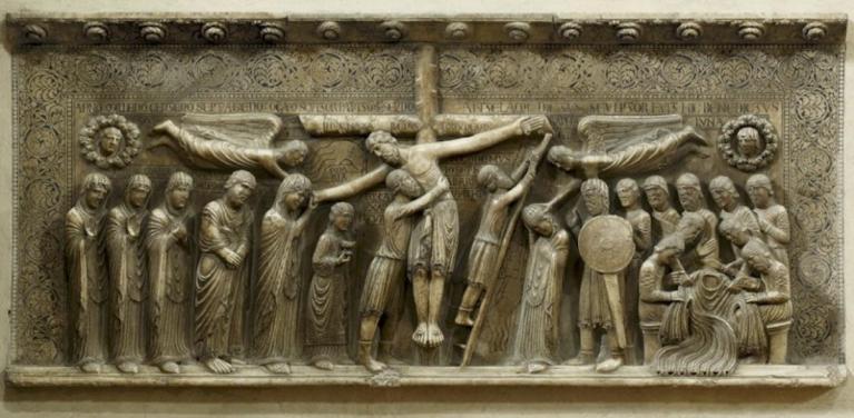 Il più 'filmico' dei bassorilievi scultorei, in ordine di tempo, dopo quello della Colonna Traiana, è sicuramente la Deposizione dalla Croce nel duomo di Parma, opera su una lastra unica di Benedetto Antelami, che l'ha firmata e datata 1178. In essa la vicenda rappresentata si sviluppa su più piani narrativi, che potremmo addirittura definire 'episodi' collaterali alla scena principale, posta al centro della composizione.