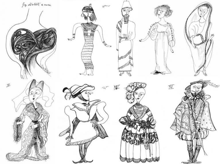 Sissi, disegni illustrativi del suo libro d’artista. In alto a sinistra: illustrazione della voce décolleté. Seguono i disegni a china Vestirsi nel tempo, 2020-2021, che illustrano la storia della moda e del vestire secondo l'interpretazione dell’artista bolognese.
