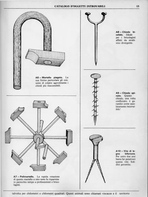 Più ci si interroga sulla mostra, più si è indotti a pensare che in questo giocoso vortice di idee abbia un suo diritto di cittadinanza il catalogo di oggetti introvabili di Carelman, con i due indimenticabili martelli intrecciati in copertina. L’accostamento, nonostante l’atmosfera surrealista, non è fuori luogo, né irriguardoso. I martelli di Alessiani e di Carelman sono imparentati, intrecciati tra loro, a dispetto della loro opposta ispirazione. A impugnarli, infatti, c’è una critica radicale dello stato di cose presente, la necessità di un black out che preluda ad una nuova luce, l’orgoglio di rivendicare la possibilità di pensare, anche solamente pensare, nuovi oggetti per nuove relazioni e nuovi modi di vivere. La rassegna dei giovani designers, tutto sommato più che esprimere un processo che dal pensiero va all’oggetto, si prende carico di una responsabilità ben maggiore: pensare oggetti che facciano pensare.