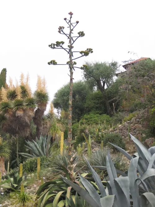 Comunque, gli ottocenteschi giardini Hambury sul pendio del promontorio della Mortola, a un passo dal confine francese e vicini alla Sanremo calviniana, ospitano una notevole collezione di queste succulente appartenenti alla famiglia Asparagaceae (eh, sì, il fiore, nella fase iniziale del suo ergersi, ricorda un grosso asparago) che rendono interessante la visita anche nei mesi invernali.
