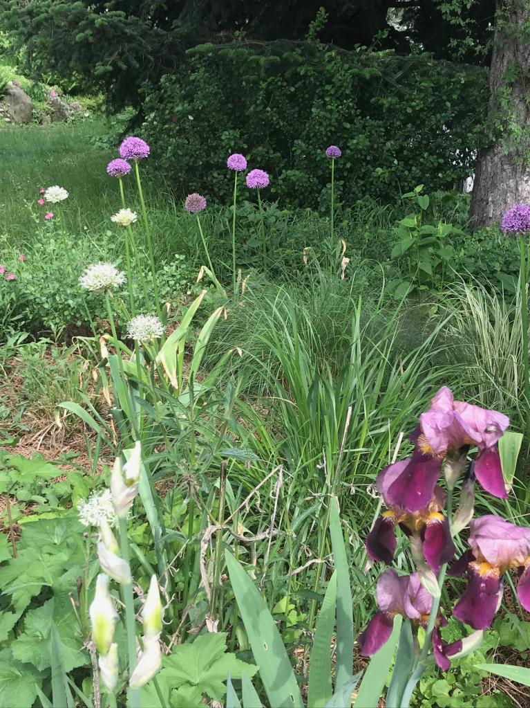 Tra le centinaia di specie coltivate e spontanee, un cenno se lo guadagnano persino i cespi grigiazzurri della sudafricana Tulbaghia violacea, perfetti da sposare al rosmarino e alla nepeta. Portano corimbi di fiorellini lilla in continuo sboccio per tutta l’estate, buoni anch’essi per dar colore e un pizzico di verve alle misticanze. Come non soffermarsi poi sulle sfere viola acciaio dell’Allium christophii o su quelle rossastre dell’Allium schubertii che paiono fuochi d’artificio; e se desiderate d’altri colori, ve ne sono di gialli (Allium flavum) e di azzurri (Allium caeruleum). Ma il mio prediletto è l’elegantissimo Allium siculum che dall’alto di steli eretti lascia dondolare rade ombrelle di pendule verdi campanelle striate di porpora, magnifico abbinato alla Fritillaria persica.