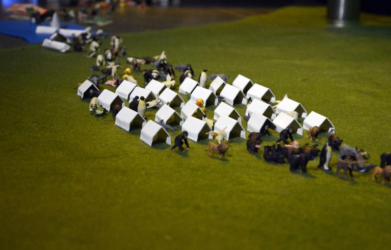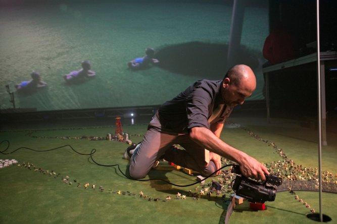 Uno sguardo parallelo sui due lavori rivela chiaramente con quanta coerenza, ma anche con quanta disponibilità al cambiamento, si stia dispiegando il percorso della compagnia. Il linguaggio scelto resta il medesimo: i performer operano in presenza movimentando una scena in miniatura, abitata da piccoli animaletti e da infiniti altri ammennicoli, e riprendono in diretta il dettaglio delle loro azioni proiettandole ingrandite su uno schermo, a beneficio del pubblico.