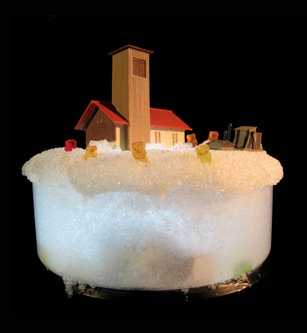 Potrebbe sembrare una raffinata e disimpegnata versione 2.0 del teatro di figura, ma c’è ben di più: lo spettatore si trova alle prese con un triplo piano costantemente attivo (gli oggetti concretamente presenti in scena; la trasposizione di quello stesso scenario nell’immagine proiettata; i performer in carne ed ossa che agiscono davanti al pubblico) ed è invitato a ragionare sugli scarti e le contraddizioni che vengono a crearsi tra i tre piani. In Katastrophe, per esempio, viene proposta una al pubblico una ‘dolce favola’ che è tutta da scomporre e decostruire: nel video di dispiegano le vicende comico-epiche di una colonia di orsetti Haribo che fronteggia una lunga serie di disgrazie naturali e di migrazioni alla ricerca di un posto dove stare.