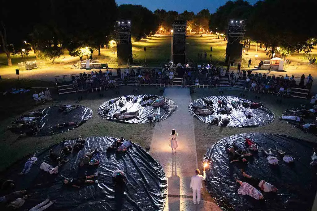Qui arriva il momento finale. Sei grandi teli circolari vengono stesi per terra e Marco invita gli spettatori a sdraiarvisi sopra, a concludere lo spettacolo sentendo l’ultimo canto, il trentatreesimo, aperto dalla preghiera alla Vergine, sdraiati, guardando l’infinito, le stelle, il cielo.