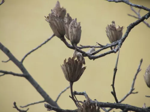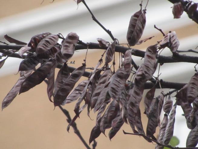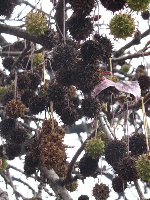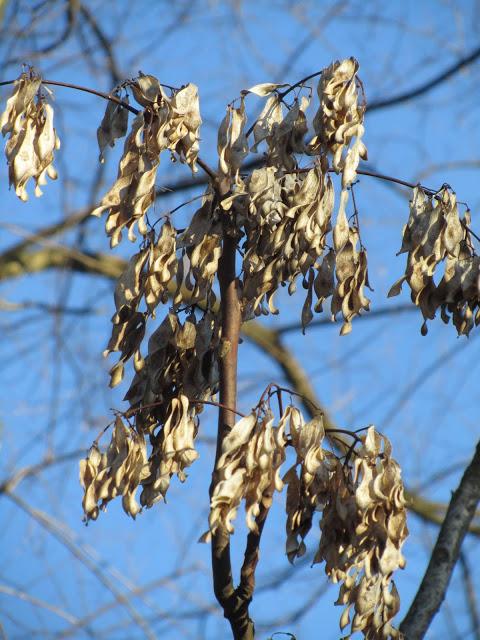 I rami, esili e folti, degli olmi ricadono nuvolosi dall’alto; i cercis si tengono stretti alle brocche i bruni baccelli. Le pendule samare cartacee impreziosiscono ancora aceri e ailanti, e le liquidambar si fanno notare per le nere sfere aculeate. I codini rosatenero dei noccioli dondolano infreddoliti, e gli ingannevoli coni dei liriodendri paiono boccioli prossimi alla fioritura: celano invece semi alati.