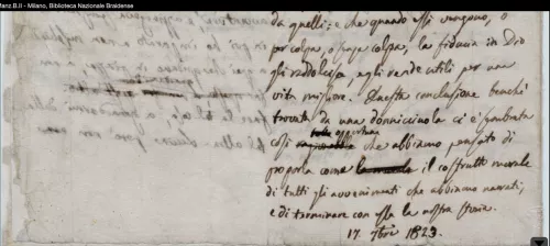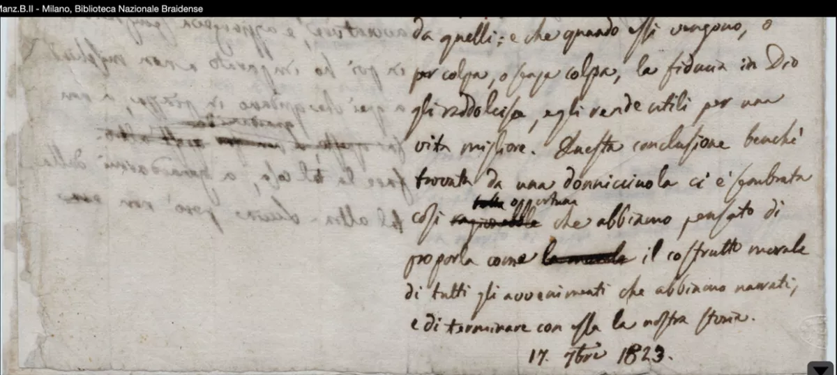 Nella mia predilezione per gli anniversari, quelli che meno mi attraggono riguardano le morti. Forse sono condizionato da fattori personali: io sono nato il 5 maggio, e ho sempre preferito ricordare che è lo stesso giorno in cui sono nati Karl Marx (1818) e Søren Kierkegaard (1813) che non il giorno in cui è morto Napoleone (1821): fatti salvi, beninteso, tutti i pregi del Cinque Maggio manzoniano. E appunto a proposito di Manzoni, piuttosto che il centocinquantesimo anniversario della scomparsa (22 maggio 1873) preferirei ricordare il duecentesimo della conclusione del Fermo e Lucia (17 settembre 1823), attestato dalla data in calce al manoscritto della Braidense, e facilmente consultabile sul prezioso sito.(Vedi anche qui).