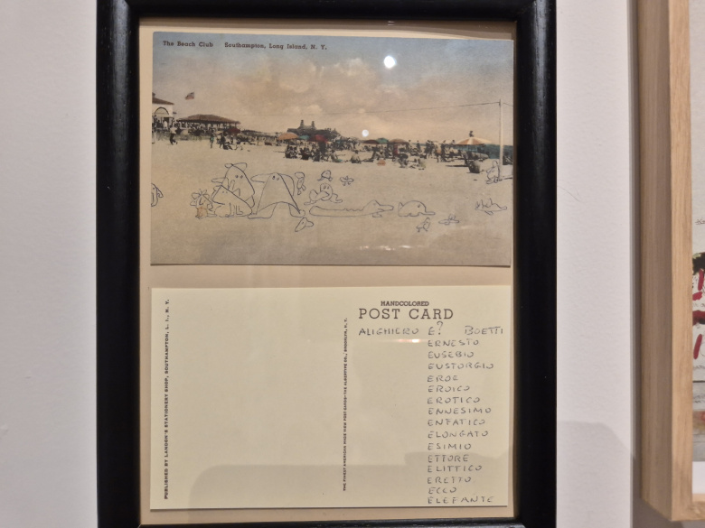 Un’opera(non-opera) capace di attestare tre elementi chiave della poetica boettiana: il tempo, la contemplazione e la paternità dell’opera. Esposto solo tre volte quando Boetti era ancora in vita (presso i Chiostri di Voltorre a Gavirate nel 1979; nella Galleria AAM /Architettura Arte Moderna nel 1982; a Lucerna, nel 1993), è poi stato mostrato anche in altre occasioni (a Ginevra, nel 2013; a Londra, nel 2016; a Milano, tra il 2019 e il 2020). Ed è un fedele ed emozionante ritratto del modo di agire e pensare di AB, composto da poco meno di ottanta elementi, tra i più disparati, dall’articolo di giornale alla foto, ai fogli di un calendario, banconote, disegni, anche di Agata Boetti, e così via, tutti incorniciati e sotto vetro, che, in questi giorni, può essere ammirato negli spazi della galleria Tornabuoni, nella mostra Cabinet de curiosités (6 novembre 2024 – 22 febbraio 2025), organizzata in collaborazione con Agata Boetti e l’Archivio Alighiero Boetti (fondato nel 1995). Una mostra che riesce ad essere il perfetto completamento di Raddoppiare dimezzando, magistralmente allestita nell’Accademia Nazionale di San Luca (29 ottobre 2024 – 15 febbraio 2025), curata da Marco Tirelli e Caterina Raganelli Boetti e la Fondazione Alighiero Boetti (fondata nel 2014). Progettate per celebrare i trent’anni della scomparsa dell’artista torinese (Torino 1940 – Roma 1994), entrambe, magnificamente, delineano non solo alcune tappe e tratti salienti dell’attività di AB, ma anche un puntuale “autoritratto” di Alighiero.
