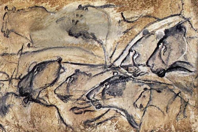 Profili di felini, grotta di Chauvet, Vallon-Pont-d'Arc, Francia.
