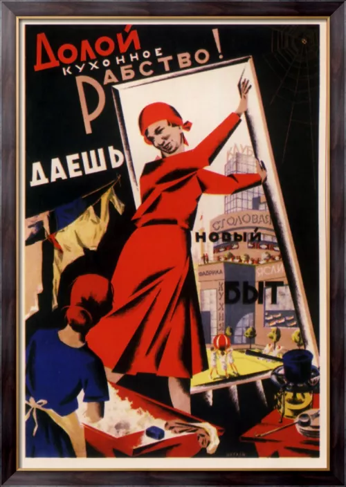 Lo spazio scenico è diviso a metà diagonalmente. Sul confine tra i due mondi si erge la donna bolscevica che già abbiamo imparato a conoscere. Tutta in rosso con un abito in cui persino le pieghe rimandano al costruttivismo e con le stesse caratteristiche che contraddistinguevano la sua omologa nel manifesto precedente. A sinistra il vecchio byt, la quotidianità, la mentalità, il comportamento arretrato e reazionario che vedeva la figura femminile relegata in cucina a occuparsi di bucato fatto a mano, panni da stendere, piatti sporchi da lavare a fianco del famigerato primus, il fornello a benzina o kerosene che imperversava nelle residenze più povere e luride. Attraverso la porta che la rivoluzionaria spalanca, come per invitare la sua vessata compagna a compiere il salto che le cambierà la vita, si delinea il nuovo byt. Quello a cui inneggia la scritta multicolore: Abbasso la schiavitù delle cucine! Evviva il nuovo byt.
