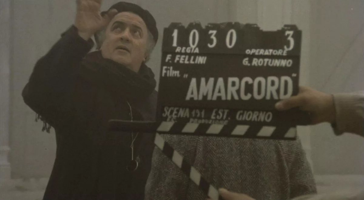 Amarcord quasi fosse il nome di un liquore (Amaro Cora). L’intento è tornare a quell’epoca con “distacco e nostalgia, giudizio e complicità, rifiuto e adesione, tenerezza ed ironia, fastidio e strazio”. Amarcord (1973) viene dopo Roma (1972), un tentativo di fare i conti con la città in cui si è trasferito nel 1939 insieme alla madre, che era originaria di lì, e ai fratelli. Da lontano, Rimini diviene un mito; e se nei Vitelloni la cittadina romagnola è ricreata sul lungomare di Ostia, Amarcord, col suo décor anni Trenta precisato fin dai titoli di testa disegnati da John Alcorn, è reinventata nel Teatro 5 di Cinecittà, la vera casa-studio romana del regista.