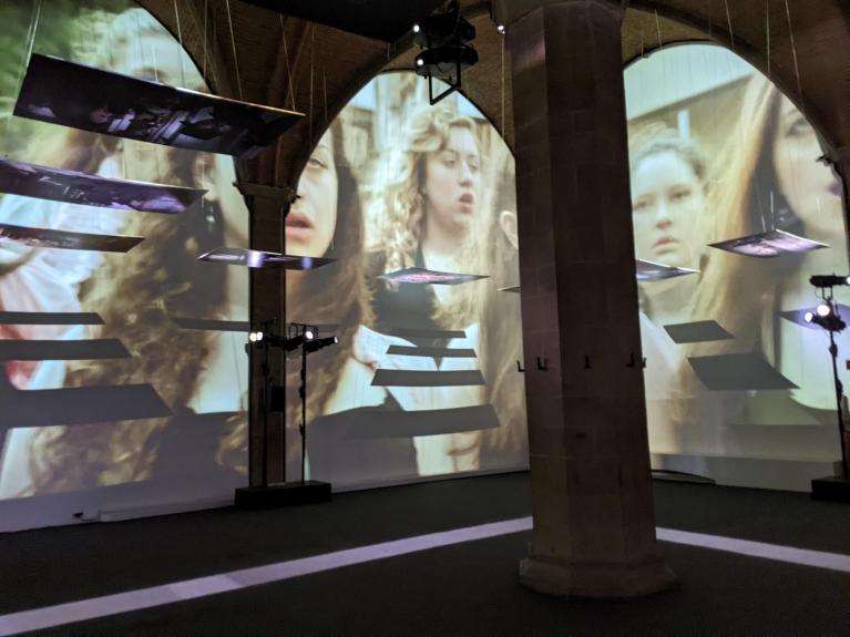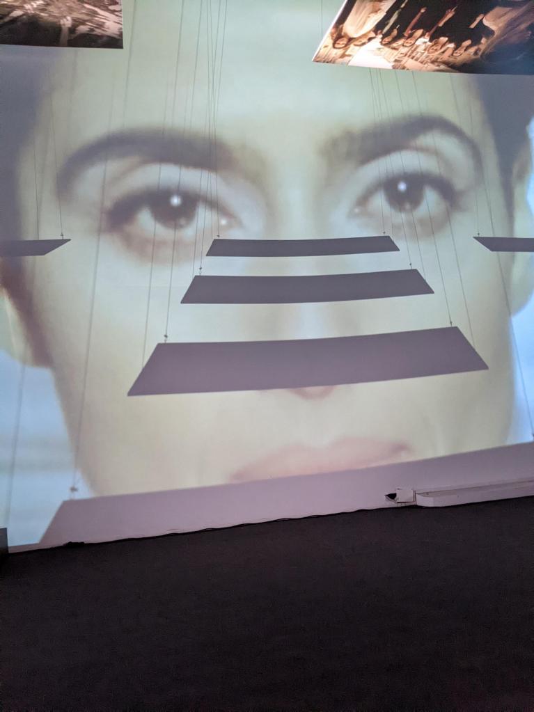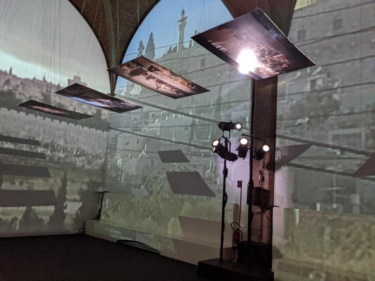 Niente è nascosto, faretti, proiettori e impianti sono a vista. Il montaggio sonoro consiste in un’alternanza di dialogo e rumore, musica e silenzio. Si passa dal rumore assordante di un elicottero (da Kippur) a un lungo frammento da Giuseppe Flavio, recitato dall’inconfondibile voce di Jeanne Moreau (in Carmel) su immagini di Gerusalemme in fiamme. L’istallazione richiede un coinvolgimento totale, siamo immersi in immagini in movimento. E noi stessi ci muoviamo nella sala attratti ora da questo ora da quello. Niente a che vedere con lo zapping: si tratta di sequenze di frammenti orchestrate ad arte.