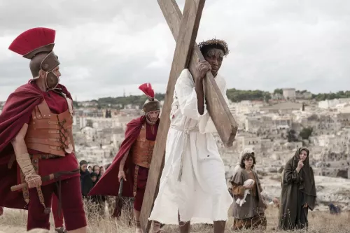 Tutto questo fa di The New Gospel un inestricabile continuum di realtà e di rappresentazione, di cerimoniale artistico e di processo politico, un’opera in azione che produce da sé il proprio discorso – messa in scacco, la critica non può che naufragare nella ripetizione o assestarsi nella neutralità della descrizione ecfrastica – articolandolo su due piani distinti che si compenetrano senza mai alterarsi, in una sorta di sovrimpressione: il Vangelo delle origini, che risuona nella sua purezza sulle labbra di Yvan Sagnet, l’attivista e scrittore camerunense scelto da Rau per interpretare il Cristo, e della sua sequela, e il nuovo Vangelo del XXI secolo, quello della dignità umana, che insorge dalle baraccopoli rurali e si organizza in slogan, assemblee, cortei che tracimano lungo le strade di pietra della Gerusalemme lucana, dove persino il sindaco in carica, per “sentirsi al servizio”, non disdegna di vestire i panni di Simone di Cirene, l’uomo che i romani costrinsero ad aiutare Gesù a portare la croce nel cammino verso il Golgota (ma con squisita accortezza politica rifiuta invece di interpretare quello di Ponzio Pilato affidato a Marcello Fonte, il più professionista degli attori non professionisti).
