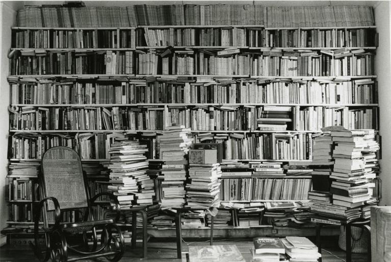 Nel 1976 la fotografa e cineasta Babette Mangolte scatta questo incisivo ritratto indiretto della critica. Michelson è presentata metonimicamente attraverso uno i suoi strumenti di lavoro: i volumi stretti sugli scaffali. I libri e le riviste infilati orizzontalmente per riempire i pochi spazi vuoti sono numerosi. Altrove, su tre sgabelli e un coffee table si stagliano come colonne sghembe e precarie diverse pile di pubblicazioni. Sulla sinistra del quadro una sedia a dondolo con lo schienale in paglia di Vienna ben visibile – vuota. Questo spazio non è necessariamente un’area di lavoro. Meglio: non è (solo) uno spazio di produzione, o di scrittura. Michelson ci è consegnata, in absentia, soprattutto come una lettrice. E nel 2014 non aveva certo smesso di leggere: “Stanno pubblicando gli scritti completi di Jean Epstein e per la mia rivista [October] ho scritto un pezzo su di lui che farà sicuramente arrabbiare qualcuno.” Oltre all’indefessa attività, la ricerca della provocazione teorica. Ma forse entrambe queste caratteristiche sono declinazioni plausibili di un tratto particolarissimo della sua traiettoria intellettuale: l’esigenza.