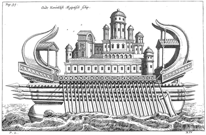 È il caso anche del thalamegos di Tolomeo IV, perché Ateneo trascrive la strabiliante descrizione che ne fece un contemporaneo del sovrano, Callisseno di Rodi: doppia prua e doppia poppa, file di colonne, vestiboli, porte, marmi raffinati e materiali preziosi, saloni per i pranzi, spazi porticati, camere da letto, immagini della famiglia reale, grandi tendaggi. Questa e le altre navi descritte da Ateneo – fastosi palazzi galleggianti – non potevano che suggerire ricostruzioni, ora più ora meno fantasiose, come quelle presenti in una straordinaria opera sulla costruzione delle navi, l’Architectura navalis et regimen nauticum (1690) dell’olandese Nicolaes Witsen.