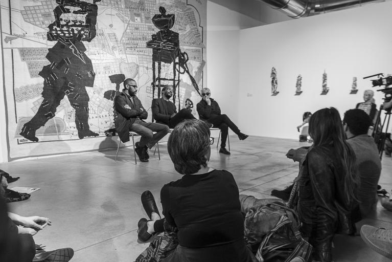 Talk con Simon Njami, Adama Sanneh e Marco Scotini all’interno della mostra Il Cacciatore Bianco / The White Hunter. Memorie e rappresentazioni africane presso FM Centro per l’Arte Contemporanea, Milano. Sullo sfondo: William Kentridge, Office Love, 2001, Collezione Laura e Luigi Giordano.