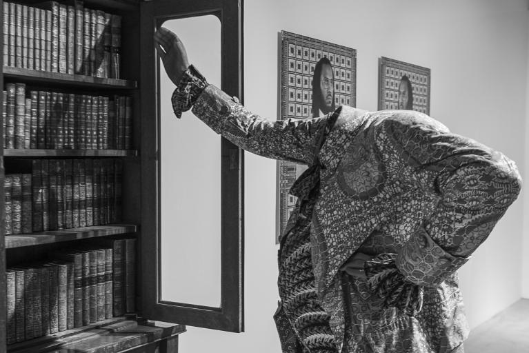 In primo piano: Yinka Shonibare, The age of Enlightment – Adam Smith, 2008, Collezione La Gaia. In secondo piano: Rashid Johnson, Self Portrait as the Professor of Astronomy, Miscegenation and Critical Theory at the New Negro Escapist Social and Athletic Club Centre for Graduate Studies, 2008.