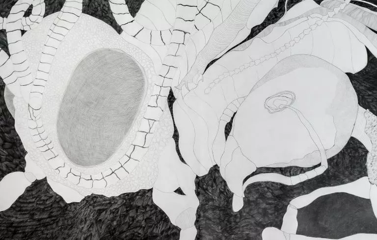 L’opera che qui si commenta ne è testimonianza. Azzardiamone un’ekphrasis: sulla scena, faticosamente contenuta nel limite istituzionale della cornice, c’è il procedere di formiche giganti che sembrano impegnate in quel pasto comune e in quella digestione condivisa che i mirmecologi chiamano trofallassi o ectotrofobiosi, «una modalità di alimentazione, racconta Wikipedia, che integra elementi di socialità; in pratica un individuo usa condividere il cibo assunto precedentemente con altri individui del proprio gruppo sociale/famiglia. Avviene principalmente tra insetti sociali come vespe, termiti, api, ed in particolare tra le formiche, le quali hanno uno spazio apposito all'interno del proprio corpo detto "stomaco sociale" o “ingluvie”». Un pasto osceno, insomma, che annulla ogni individuazione, trasformando una molteplicità di esseri in un unico tubo digerente, dove ano e bocca si confondono, come nei sogni del chirurgo pazzo di Human Centipede (horror di Tom Six del 2009), che assemblava corpi vivi per produrre un centopiedi umano. Tutta l’arte dell’Atelier è l’arte di quell’epoca del mondo in cui il mondo è costretto a fare i conti con il suo fondamento mostruoso, ma lo fa con una “gioia” che mette in allarme i benpensanti che preferiscono rubricare queste operazioni nella categoria rassicurante del “disagio psichico” e della sua terapeutica espressione. Ma non è così. Questa epopea teratologica non è sintomo di nessuna mancanza e l’Atelier non è un ospedale da campo.