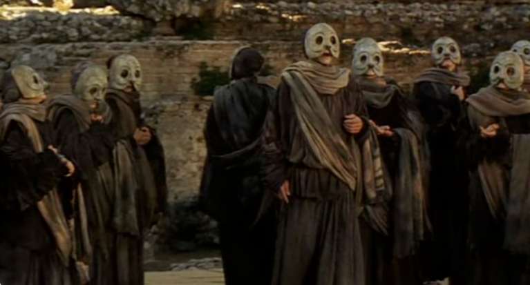 È Thomas S. Eliot a descrivere, con una sequenza di immagini volutamente grottesche, la difficoltà di portare sulla scena il coro greco lontano dal suo contesto originario: il rischio – mette in guardia Eliot già nel 1951 – è quello di provocare nel pubblico un effetto di comicità involontaria (per un riuscito esempio di parodia volontaria su tuniche o coturni, invece,vale la pena riguardare Mighty Aphrodite di Woody Allen, 1995).