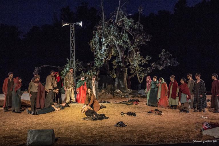 L’edizione, che segna un cambio di rotta al timone dell’Istituto (da quest’anno il direttore artistico è Roberto Andò), si contraddistingue per un’estetica sobria, lontana da certi “colossal teatrali”a cui ci ha talvolta abituato il festival: Carlo Sala, che firma la scena di entrambi gli allestimenti, marca lo spazio con un solo albero, a evocare simbolicamente le radici e i resti di una polis che distrugge se stessa conuna guerra fratricida.