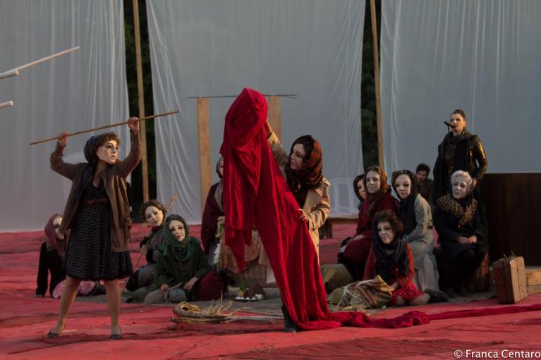 La soluzione scelta da Valerio Binasco si colloca sul versante opposto. Nelle Fenicie Euripide decide di dar voce a un gruppo di straniere, provenienti dal mare di Tiro (l’odierno Libano): le donne si trovano a Tebe per caso, e divengono osservatrici esterne ma loro malgrado coinvolte nel conflitto. Binasco crea, in sinergia con Carlo Sala, un’immagine di straordinaria bellezza: un gruppo quasi kantoriano di figure sedute, mascherate, coperte di foulard e cappotti scuri. I loro volti parlano di un’alterità di provenienza senza marcarla, e la loro presenza immobile sul palco costituisce un costante piano d’ascolto ai fatti tragici, come una rappresentanza degli spettatori sul palco.