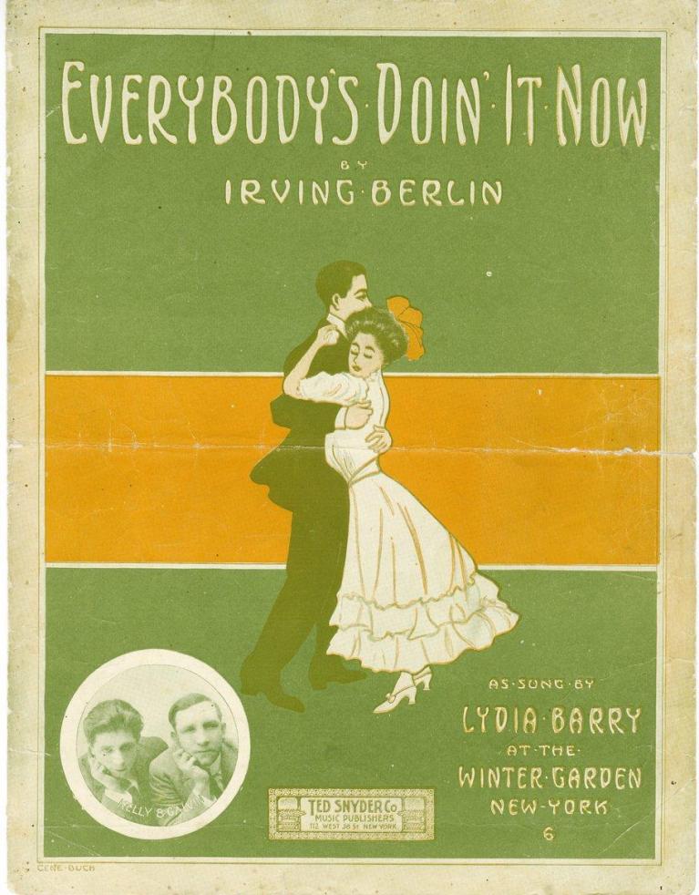 L’esigenza di muovere il corpo che travolse New York e le città d’America in quegli anni – Happy Feet! I've Got Those Hap-Hap-Happy Feet!, avrebbe intonato anni dopo Bing Crosby – chiese d’un tratto della nuova musica e delle nuove canzoni. L’industria musicale e in particolare l’editoria musicale di Tin Pan Alley conobbe, proprio sul finire dell’Ottocento, un enorme sviluppo. Comporre una canzone di successo era l’obiettivo inseguito dai musicisti più diversi, oltre che dai segugi della rima facile (love-above, june-moon; l’equivalente del nostro cuore-amore). Bastava un tema azzeccato per uscire dalla miseria e guadagnarsi, se non proprio uno status sociale, almeno la fama. Qualcuno ci riuscì, fra le migliaia e migliaia che ci provarono (Ring Lardner e George S. Kaufman dedicarono al tema una spassosa commedia in tre atti nel 1930: June Moon, in cui un aspirante paroliere sbarca a New York dalla provincia convinto di avere per le mani le rime di cui il paese è in febbrile attesa; inutile dire che il paese non saprà che farsene, delle sue rime). A suo modo esemplare, ma anche unico, il caso di Irving Berlin. Nato Israel Baline in Siberia nel 1888, emigrato con la famiglia a New York nel 1893, cresciuto nella miseria nel quartiere del Lower East Side, finì col diventare il più amato compositore nella storia della canzone americana. Berlin s’era fatto le ossa come singing waiter in un piccolo caffè in Pell Street, a Manhattan (la figura del cameriere-cantante, professione caratteristica della New York downtown al passaggio del secolo, prevedeva che ad avventori e clienti di un dato locale fosse garantita la presenza in sala di un cameriere che serviva ai tavoli cantando o parodiando il motivetto del momento). Autodidatta, senza uno straccio di preparazione musicale, Berlin si dimostrò assai abile nel cogliere lo spirito dell’epoca, puntando senza indugio sulle tendenze e le mode del momento, a cominciare proprio dal ragtime. Nel 1911 pubblicò tre canzoni che fecero la sua fortuna: Alexander’s Ragtime Band, That Mysterious Rag e la citata Everybody’s doin’ it.