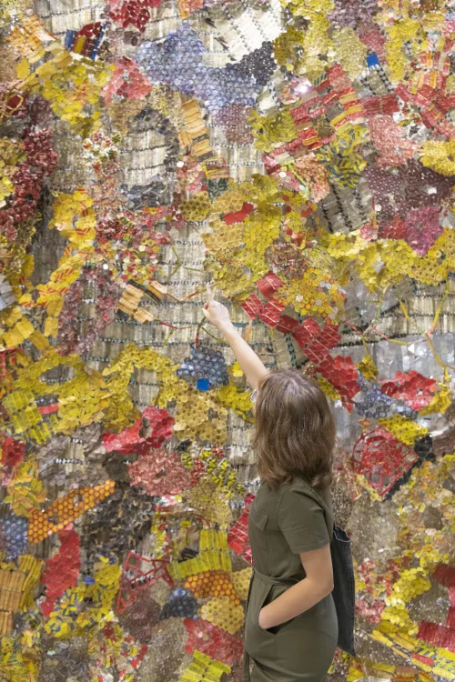 El Anatsui. Behind the red moon. Installation view. L'artista alla Tate Modern 2023.