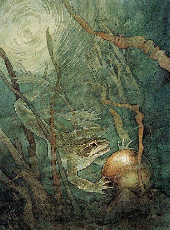 Ora avvenne un giorno che la palla d’oro della principessa non ricadde nella manina ch’essa tendeva in alto, ma cadde a terra e rotolò proprio nell’acqua. La principessa la seguì con lo sguardo, ma la palla sparì, e la sorgente era profonda, profonda a perdita d’occhio. Allora la principessa cominciò a piangere, e pianse sempre più forte, e non si poteva proprio consolare. E mentre così piangeva, qualcuno le gridò: “Che hai, principessa? Tu piangi da far pietà ai sassi.” Lei si guardò intorno, per vedere donde venisse la voce, e vide un ranocchio, che sporgeva dall’acqua la grossa testa deforme.“Ah, sei tu, vecchio sciaguattone!” disse, “piango per la mia palla d’oro, che m’è caduta nella fonte.”