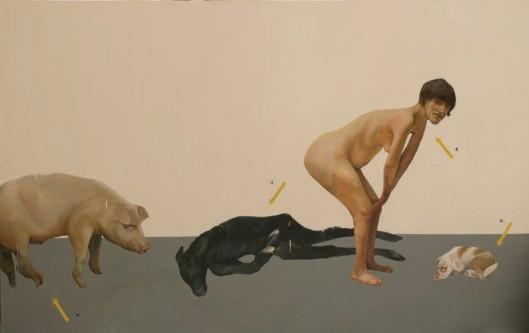 Molti quadri di Sunaura Taylor riprendono il tema da side show dell’animalità-disabilità, trasvalutandone le valenze, rappresentando il suo corpo al fianco di animali con posture simili, ripetendo così la mossa teorica dell’assunzione, trasvalutazione e rivendicazione del marchio dello stigma, in continuità con le teorie crip e queer. Animalità e disabilità si intrecciano in modo sempre più articolato, l’esperienza soggettiva della disabilità è la matrice di tale trama: “Nel corso della mia vita sono stata paragonata a svariati animali. Mi è stato detto che cammino come una scimmia, che mangio come un cane, che le mie mani assomigliano alle chele di un’aragosta e, in generale, che assomiglio a un pollo o a un pinguino” (p. 169).