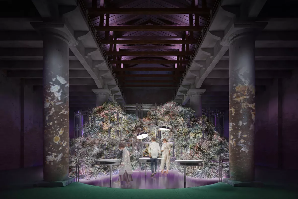 Di fronte a noi si para un grande muro, una parete semicircolare di mattoni realizzati con materiali della laguna veneta che nel suo lato B ci accoglie con un paesaggio opposto, composto da una dimensione cavernosa, quasi frattale che avvolge una serie di schermi in cui immagini di colonie di batteri vengono rappresentati. Questa installazione, disegnata da Patricia Urquiola, con la curatela scientifica di Beatriz Colomina, Mark Wiegly, Goeffrey West e Roberto Koller ci racconta due cose correlate: che la curva demografica sta per raggiungere il suo picco intorno ai 10 miliardi di abitanti ma sta già scendendo in tutto il mondo (Africa compresa) e che invece dovremmo imparare dai batteri che hanno la capacità di adattarsi a ogni ambiente che colonizzano contenendo la loro crescita e prosperando in maniera efficiente. Il messaggio è che, con una decrescita progressiva, avremo porzioni intere di metropoli progressivamente abbandonate, abitate da una popolazione sempre più fragile e invecchiata e questo scenario è una delle realtà con cui l’architettura, ma prima di tutto la politica, dovrà confrontarsi a breve.