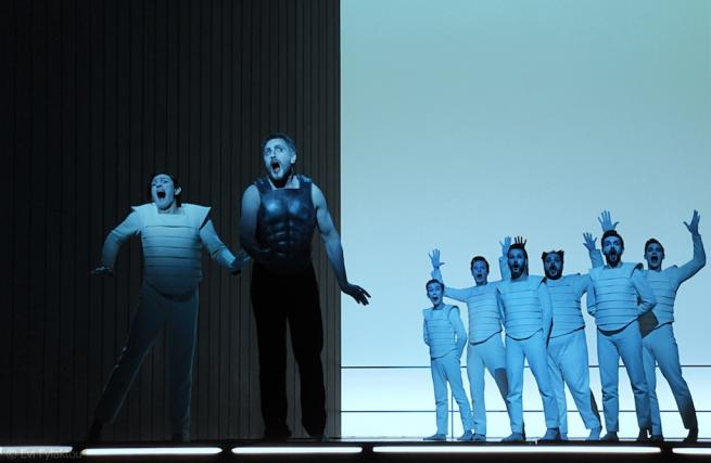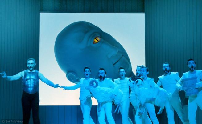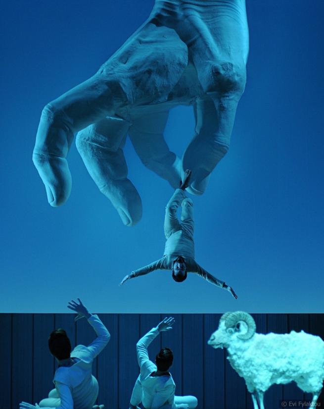 Anche la riscrittura di Simon Armitage (nata nel 2004 per il canale radiofonico della BBC) si rivela scelta felice e ben calibrata. Le vicende dell’astuto Odisseo paiono qui più snelle, ironiche, essenziali fino quasi alla schematicità, adatte al rapidissimo succedersi di immagini, suggestioni, cambi di scena. Wilson consegna dunque al suo pubblico un bagaglio non troppo ingombrante per il viaggio: un viaggio che – come può attendersi chi conosce il lavoro del regista americano – si svolge quasi tutto sul piano visivo. Il risultato è uno spettacolo lieve, che sorprende nel suo magistrale utilizzo delle luci e nel suo continuo mutare forme, registri e codici espressivi: i compagni di Odisseo si muovono come i protagonisti di un film muto, tra faccette ammiccanti e stacchi danzati, il mostro mitico Scilla ricorda un tirannosauro alla Jurassic Park, il cane Argo è una ballerina con la cresta punk, Tiresia fa venire in mentre Matrix, mentre vaticina con cappotto e occhiali da sole. A queste trovate leggere, ironiche, dissacranti, fanno eco immagini di più ampio respiro, non prive di slancio lirico; ed è un cambio di atmosfera affidato per lo più alle figure femminili, Calipso, Circe, Penelope. Le tre donne – significativamente interpretate della stessa straordinaria attrice, Maria Nafpliotou – si fondono e divengono un unico volto amato, in tutte le sue ipostasi. Wilson le rappresenta tutte e tre statuarie, intense, eteree come Isabelle Huppert nelle sue Relazioni pericolose. A sfuggire a questa iconografia fatale è invece la giovanissima Nausicaa, depositaria della narrazione di Odisseo presso la corte dei Feaci; infantile, scanzonata, sognante, la principessa non ha ancora i contorni di una donna.