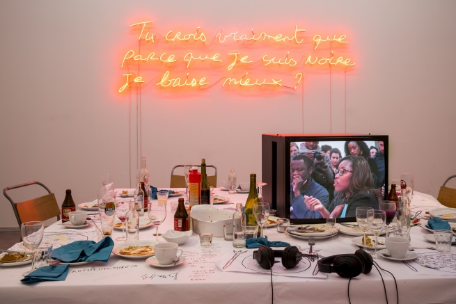 Abbandonato il rumoroso silenzio delle sbarre di ferro (le performances della Oka si sono svolte nello stesso momento in sale differenti, sono state registrate e successivamente trasmesse da uno schermo televisivo), ci imbattiamo nei resti sensibili e al contempo immateriali di “un’ultima cena” consumata dai suoi “invitati” a suon di provocazioni, domande, dibattiti e riflessioni aperte proprio intorno a queste domande e oltre. Riuniti intorno a un tavolo, i dodici commensali (compresa l’artista), infatti, si sono confrontati su numerosi e spinosi temi, attuali e non, come la condizione della donna nell’Africa del Sud post-apartheid, sugli orrori perpetrati da più di un secolo di colonialismo britannico, olandese e francese, sull’auto-immolazione durante l’Ottocento di molte donne africane per impedire il loro commercio per mano degli Arabi, sugli effetti provocati dal capitalismo in Kenya e sul senso profondo di un’arte femminista africana. Oltre a residui di caffè, cibi vari, appunti, pensieri, gesti, disegni, scarabocchi e parole sparse sulla tovaglia, questi insoliti “ospiti” hanno lasciato in memoria anche un insieme straordinario di emozioni, affetti, ricordi, tensioni e provocazioni “incrostati” su piatti, bicchieri e posate. (Valérie Oka, En sa présence, 2015).