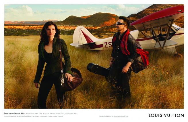 Nel 2010 Luis Vuitton lancia una pubblicità per una serie di valige in tela prodotte in serie limitata e dal costo di 1000 dollari l'una. Nella foto sopra alla scritta «Ogni viaggio comincia in Africa» Bono e la moglie Ali appaiono appena scesi da un vecchio aeroplano con le borse in primo piano, in quella che si direbbe una savana. Lasciando perdere il carattere kitsch della messa in scena in pieno stile coloniale, è opportuno sapere che la casa madre che produce le valigie (LVMH) è una consociata della società diamantifera De Beers, il cui coinvolgimento nello sfruttamento in aree del continente non è certo un mistero. Bono e Ali indossano abiti di un marchio “etico” e “organico” di loro proprietà, Edun, nato per “incoraggiare il commercio con l'Africa”.