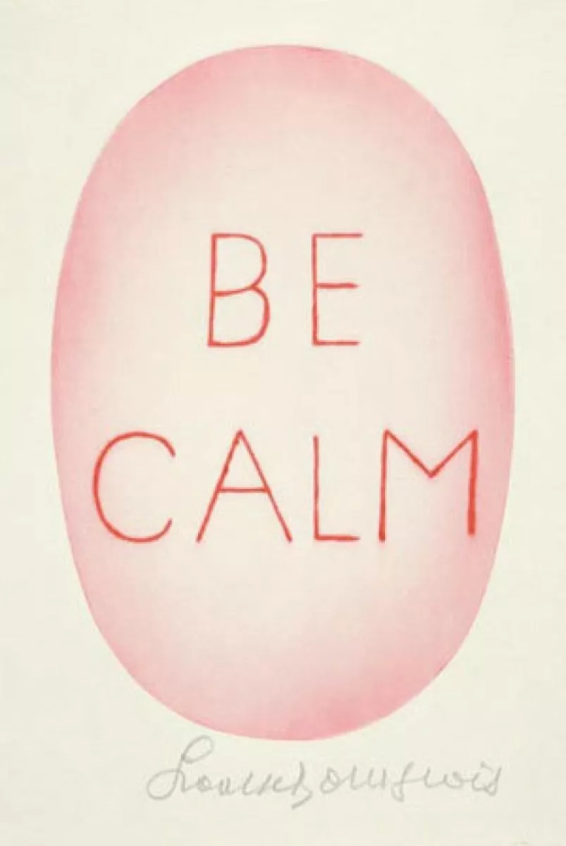 Sul leggio della mia scrivania tengo una cartolina con la scritta Be Calm. Lo sfondo avorio accoglie un ovale dove il rosso sfuma, ma sul rosso delle lettere non ci sono dubbi: l’acquaforte di Louise Bourgeois in formato tascabile conserva la dimensione di tutta la sua opera che provoca e ripara.