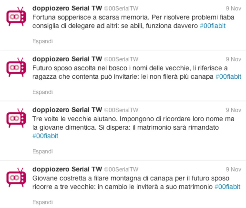 Allora tiriamo le somme. Quante di queste regole ho osservato? Prima di tutto, grazie a un consiglio del gruppo TW di Doppiozero, ho separato il riassunto (i tre tweet) dal commento (il quarto), che non è di tipo critico-saggistico bensì morale: la morale della storia con gli occhi di oggi (o quasi). Ma sono dei veri riassunti quelli che ho fatto nei tre tweet? Sì e no. Ho seguito la prima regola data da Calvino (“deve essere costituito da enunciazioni, pensieri e parole contenute nell’opera”), ma non sempre quella stilistica, poiché ho usato a volte sinonimi delle parole della fiaba per necessità di spazio (ho usato sinonimi brevi). Conclusione: è un riassunto per tre quarti, con un dubbio stilistico riguardo al rimanente quarto.