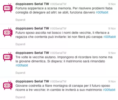 Risponderei così: entrambe le cose, poiché riscrivo riassumendo. Twitter con i suoi 140 caratteri impone una riduzione di spazi; e avendo stabilito di fare ogni fiaba, indipendentemente dalla sua lunghezza, in tre tweet, il risultato è prima di tutto un riassunto. Ma vediamo cosa sarebbe esattamente un riassunto. Per farlo uso ancora Calvino. Nel numero de “L’Espresso” del 10 ottobre 1982 Umberto Eco lancia una piccola sfida: “Elogio del riassunto”. Spiega quanto sia utile fare dei riassunti, che lui ne ha fatti molti, non solo a scuola – dove in genere si odiano –, ma anche dopo, nei primi lavori alla Rai, e poi sulla “Rivista d’Estetica”. Non ci dice cosa sia un riassunto, ma ne accumula alcuni dell’Ulisse e fa seguire 12 esempi chiesti a vari scrittori, poeti e saggisti: Moravia, Giudici, Bertolucci, Malerba, Arbasino, Calvino, Garboli, Raboni, Guarini, Mariotti, Chiara e Eco stesso.