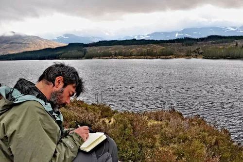 Se hai viaggiato in questi tre punti cardinali dell’antico mondo e l’animo è pronto, l’occhio agile, il piede sveglio, non puoi evitare di agire secondo l’istinto che ci ha detto di cambiare piano. I due complici sono qui con me – ci siamo avviati in tre su quattro ruote con la Grande P, come in un viaggio di fine secolo ventesimo, sino a questa latitudine. L’alba ci è stata vicina e durante l’avvicinamento abbiamo confidato sull’idea di dipingere ritratti del territorio – Loch Fada e Loch Leathan sono acqua che riflette desiderio, crinale che nasconde l’oceano e l’isola Raasay, contorni da sfiorare. Vorremmo camminare su queste acque, librarci sui pendii, sorvolare il Trotternish Ridge. Vorremmo. Ma ora è fondamentale concentrarsi, penetrare il vento e la luce che attendono il sentiero fatto d’alba. Appare sempre più evidente che il movimento dovrà leggere il punto cardinale di giornata, dove terre emerse e acque vaste si danno appuntamento nel grembo del tempo che regola la loro relazione.