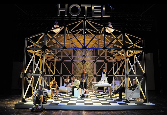 Di questo imprinting giocato in farsa e costumi d’epoca ai piedi di una scala bianca che rappresenta un palcoscenico, lo spettatore non si libera mai del tutto: la sua sovrimpressione continua a velare i quadri successivi, grazie e malgrado gli attraversamenti di tempo e di genere che strutturano lo spettacolo. Per Ravenhill il personaggio di Voltaire appare e scompare, si dilegua e riaffiora come una soluzione di contrasto: lo perdiamo in un albergo dell’Europa contemporanea dove un’adolescente massacra l’intera famiglia (a riprova che no, l’immaginario liberalcapitalista che la ragazza ha avuto in eredità non è il “migliore dei mondi possibili”, ma soltanto l’unico esistente), poi negli studi televisivi dove quella stessa strage viene ricostruita e manipolata fino a diventare irriconoscibile. Ma ecco che, nel quarto quadro, lo ritroviamo ancora in viaggio, mentre approda in un edenico Eldorado che ha l’innocenza e l’ottusità dello stato di natura teorizzato da Jean Jacques Rousseau (il suo Discorso sull’ineguaglianza è del 1755, Candide del 1759).