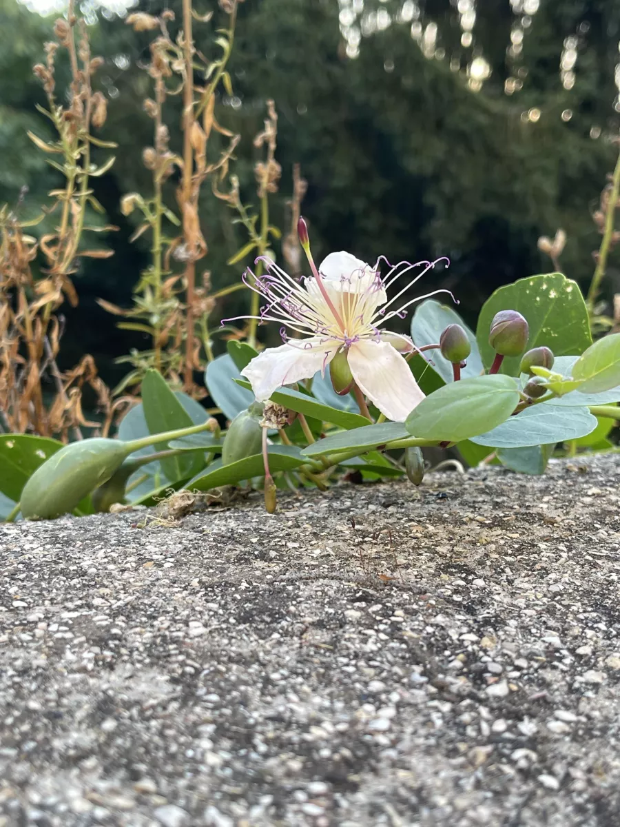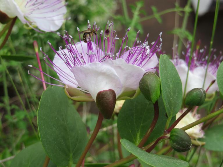 La Capparis spinosa è una pianta perenne e sempreverde. L’epiteto della specie è dovuto alle stipole fogliari ridotte a brevi spine ricurve e, nella più diffusa varietà inermis, erbacee e di presta caducità. Amante del sole e dell’aria marina, di suoli aspri meglio se vulcanici, la pianta si è naturalizzata anche in regioni continentali dai climi temperati. Allo stato spontaneo predilige gli anfratti di vecchi muri da cui lascia ricadere a cascata i lunghi rami arcuati con le belle foglie alterne dal margine intero, brevemente picciolate, pelosette e carnose, ovali, talora cuoriformi alla base. I fiori sono meravigliosi: profumati, solitari su un lungo peduncolo all’ascella delle foglie, composti da un calice di quattro sepali di un verde che sfuma nel porpora, e quattro petali candidissimi con una vistosa selva di sottili stami viola. Al mezzo un ginoforo (il pedicello che sostiene il pistillo) eccedente gli stami pur estesi.