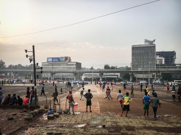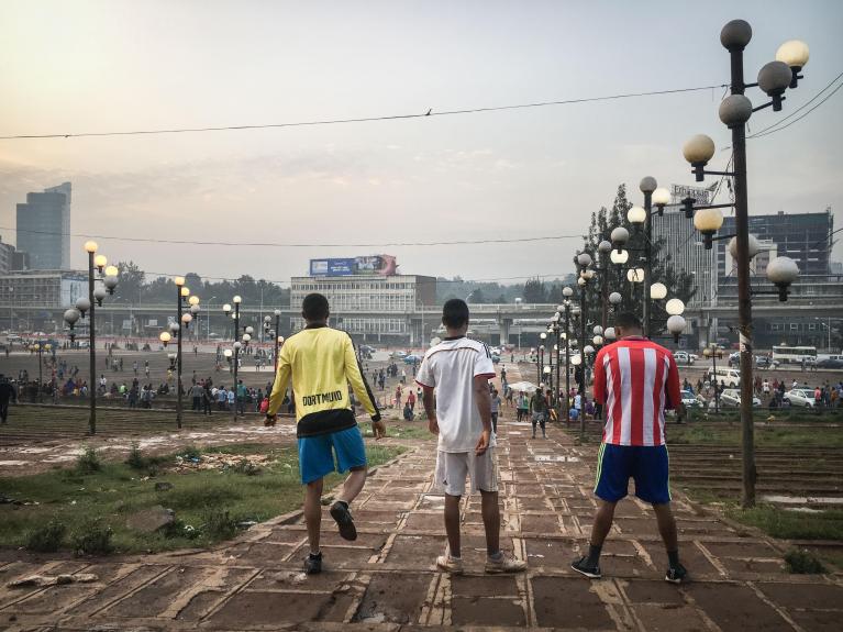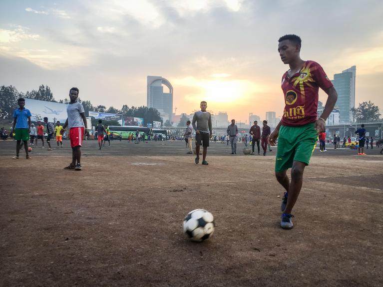 Il colpo d’occhio è semplicemente sensazionale sia per la sua geometrica armonia, sia per il simbolismo semplice dell’elemento ludico che si riappropria dello spazio, nel cuore della città, coinvolgendo persone di ogni sesso ed età. Se alcuni cerchi sono formati da amici, o comunque da persone che si danno un appuntamento, altri sono completamente improvvisati e aperti a chiunque voglia partecipare. Io vengo dalla provincia di Milano, da uno di quei paesi in cui tra cortile, oratorio e club dilettantistico il calcio era elemento di coesione supremo. Nelle città europee questa funzione di coesione del calcio si è chiaramente smarrita. Se è vero che non si può dire lo stesso per l’Africa (e in parte per il Sudamerica), è vero che nella Piazza Meskel assume una proporzione straordinaria, facendosi icona perfetta dello sport e del calcio come momento aggregativo.