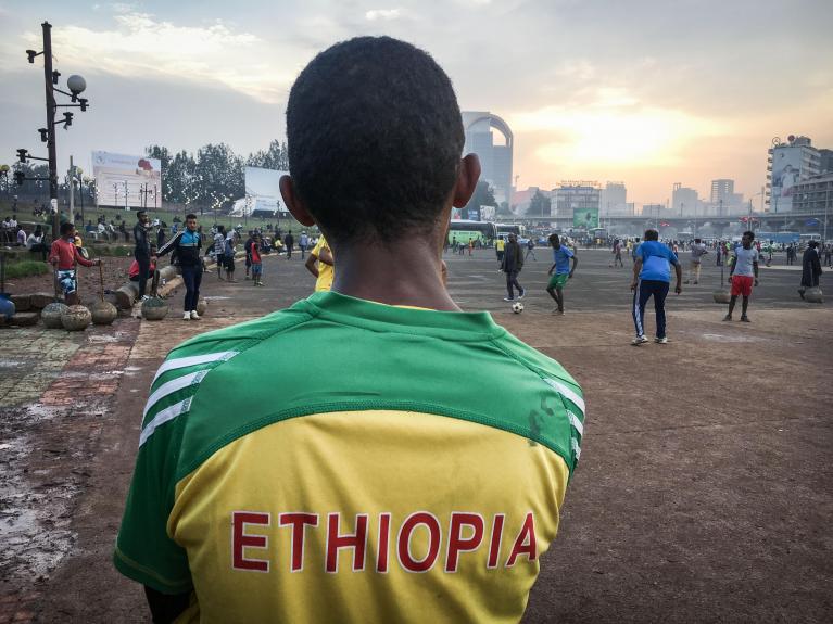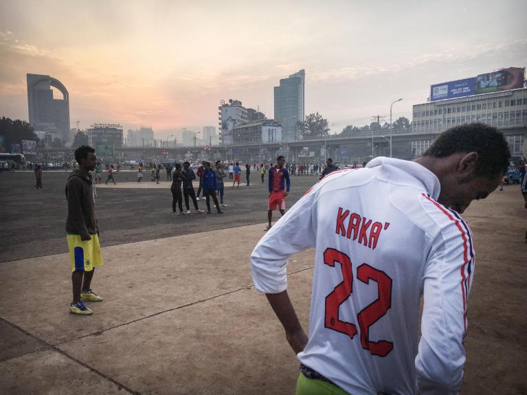 Scendendo di qualche gradone, si distinguono meglio i colori delle maglie. Molti dei giocatori portano casacche delle squadre europee, e a un primo sondaggio sembra che la Premier League sia il campionato più seguito, come del resto in tanti altri paesi africani dai tempi dei trascorsi al Chelsea di Drogba. Ma anche il passaggio di Eto’o al Barcellona ha lasciato un segno profondo, così come il vecchio fascino della Serie A (a poche centinaia di metri dalla piazza esiste ancora il Juventus Club, ristorante gestito da una famiglia italiana restata in Etiopia dopo la decolonizzazione e dove è possibile vedere le partite del campionato italiano). Ci sono anche diverse maglie gialle e verdi della nazionale Etiope, che dopo la vittoria di una Coppa d’Africa in casa, nel 1962, non ha più raggiunto alcun risultato significativo e si è qualificata una sola volta per le fasi finali della Coppa. Non ho gli elementi per dire se la Piazza Meskel sia in qualche modo metaforica dell’approccio etiope al calcio, ma se così fosse si potrebbe tranquillamente dire che gli etiopi sono bravi a giocare, ma non a vincere.