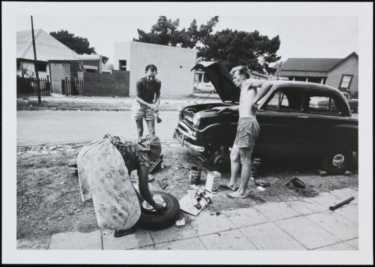 David Goldblatt, Tè del pomeriggio servito a due uomini che stanno riparando un’auto su un marciapiede a Fairview, 1965.